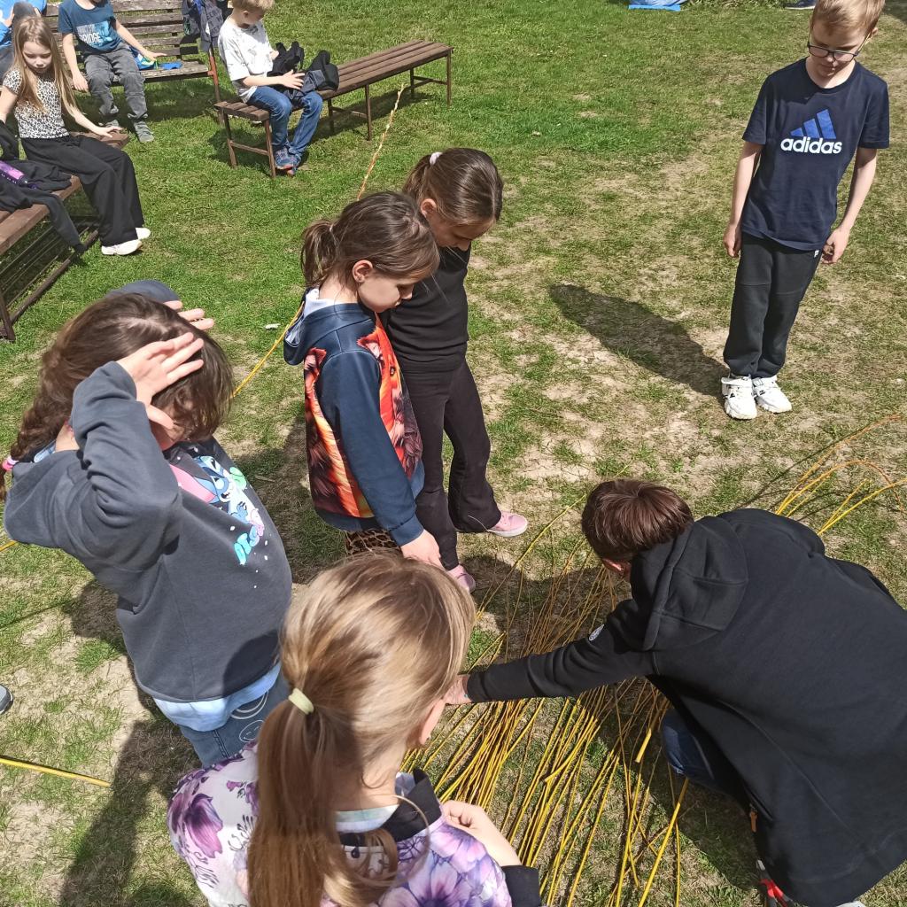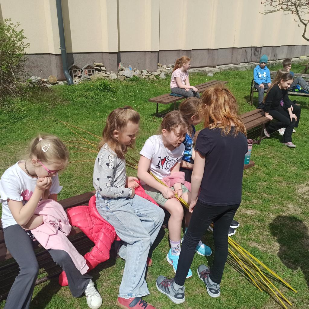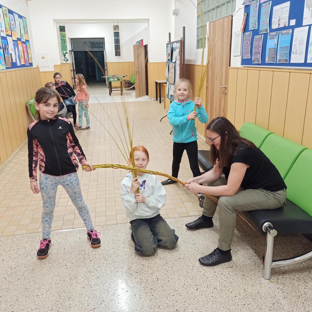 Děti v družině se s nadšením pustily do tradičního velikonočního tvoření. Paní učitelka jim ukázala, jak správně plést tatar, a všichni ji se zaujetím sledovali. Každý chtěl vyzkoušet techniku proplétání proutků a vytvořit si vlastní pomlázku.